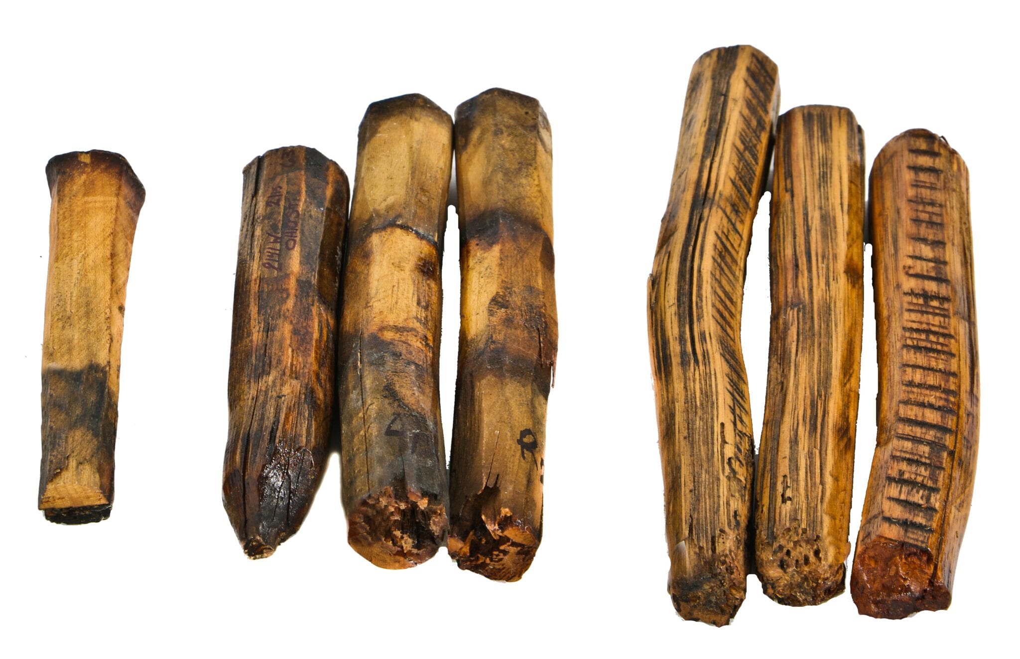 the sill plates were sawn, with circular markings evident and mostly uniform from one section to another. the heavily notched girt exhibited evidence of hewn marks, and the joists were locked into place on both sides of the beam. the faceted and tapered pegs were comprised of oak (the other previously discovered pegs are white pine) and were nearly 12 inches in length.