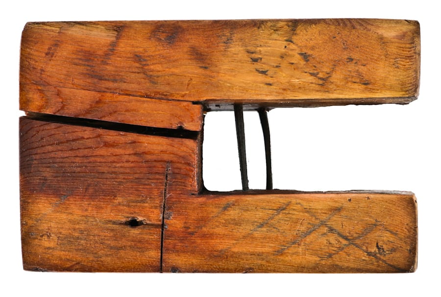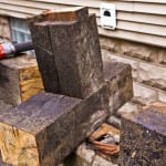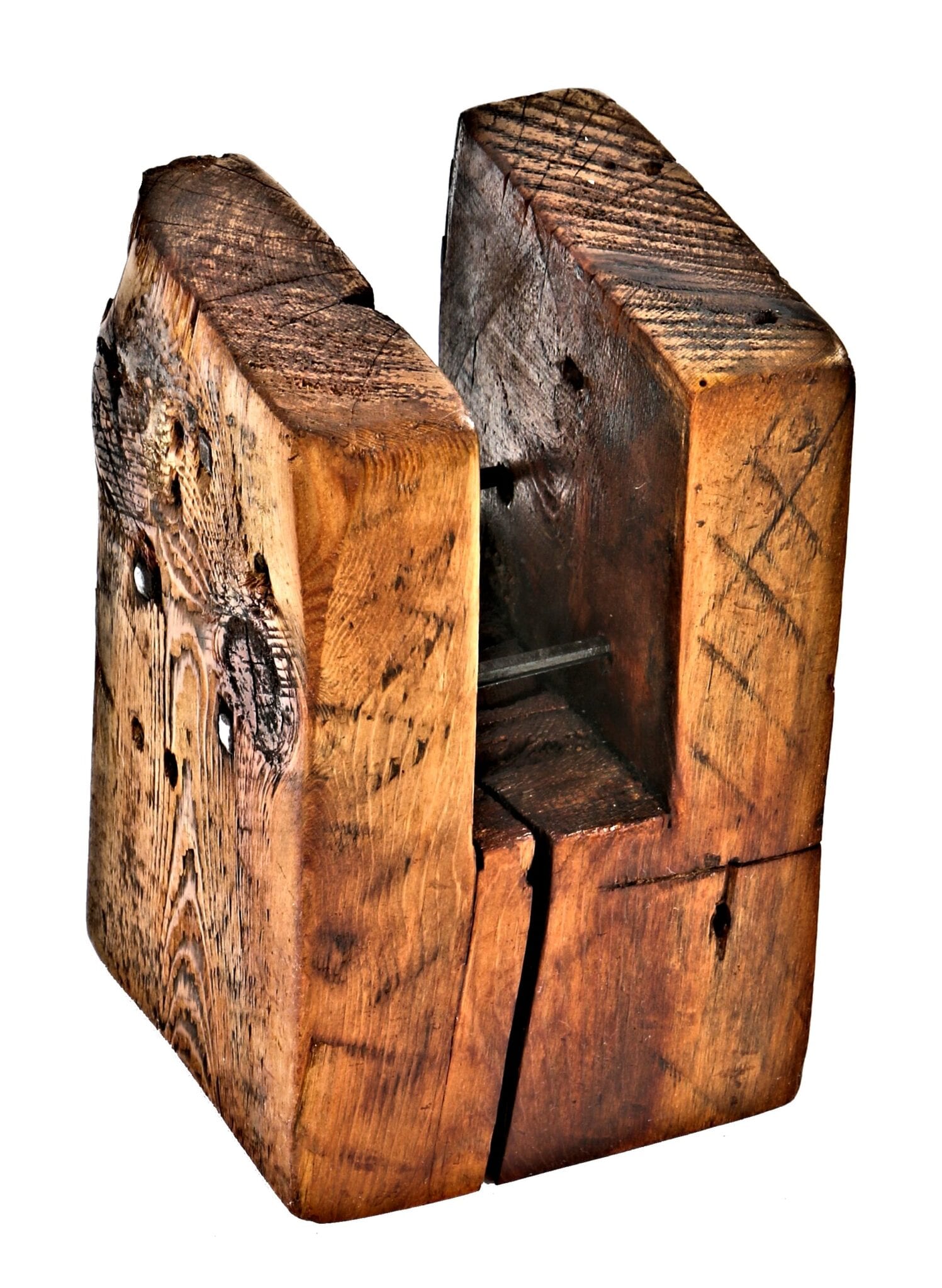 one of many hand made pine wood pegs salvaged from the interlocking beams used throughout the wood-framed chicago balloon frame house shown below.