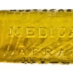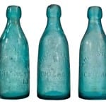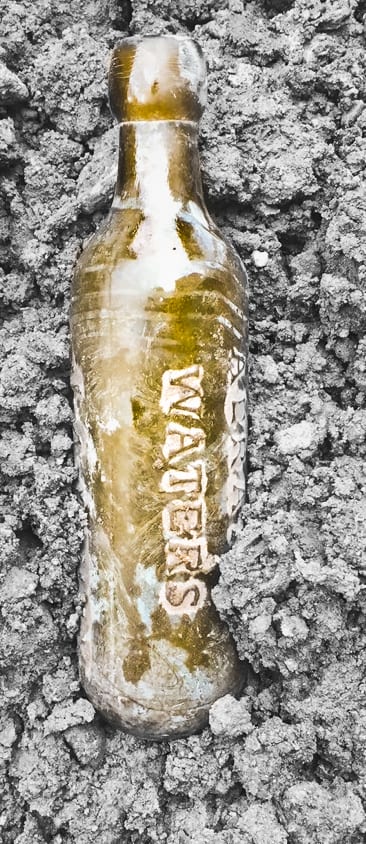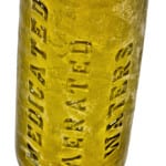 as for the contents of this privy, i found three nearly identical aqua blue james stenson soda and/or mineral water bottles, a partial hayes soda bottle (the bottles were fabricated by alexander and david h. chambers of pittsburgh, pa.), and perhaps most importantly, a “torpedo” or round bottom “medicated aerated water” bottles by john a. lomax. these blobtop bottles do not surface often and are noted for their impressive “color run” (i.e., were produced in a variety of colors). i had never seen this unusual golden yellow amber color before, so i was very pleased with my find. the blobtop was free from chips, often caused from users attacking the corks with ice-picks to drink the beverage. additionally, the deeply embossed vertical lettering along the sides of the bottle was very clear and clean.