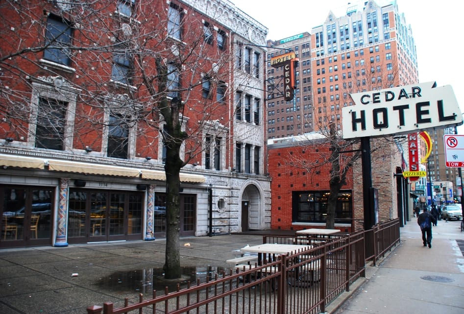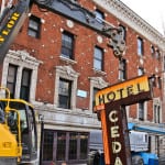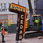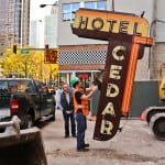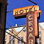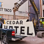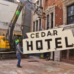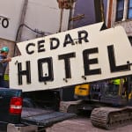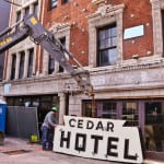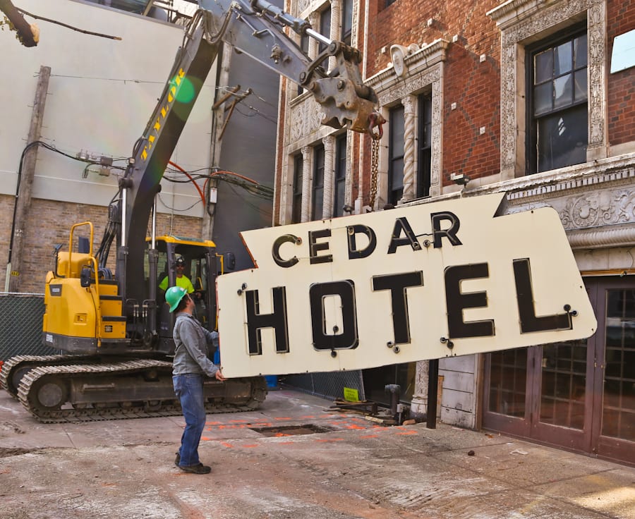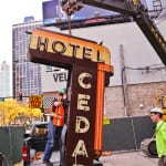 with virtually little notice and very little preparation, urban remains was given a very small window of time to secure two iconic depression era neon signs the hung (one against the facade and the other atop a signpost) from the historic cedar hotel, constructed in 1928 by architects rissman and hirschfield (the architects designed the knickerbocker hotel on west walton).