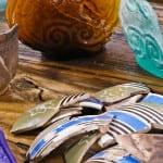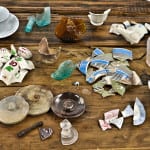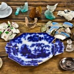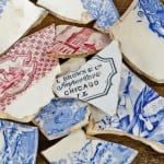 the photo gallery below shows additional fragments that were discovered in “pockets” surrounding the location of the amber flask. the aqua scroll flask fragment was found in one of these pockets, so in all actuality, a total of two flasks or fragments were discovered at this dig site. the additional fragments included mochaware, transferware, flow blue china, flint glass, etc. each and every piece of the assemblage was meticulously cleaned and documented.