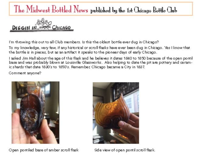 one of the sources where the “oldest bottle dug in chicago” claim was introduced to the chicago bottle club, which consists of collectors and historians alike, who have been involved in digging in and around chicago since 1969. their october newsletter made the initial announcement.