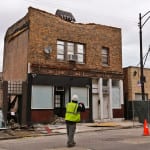 a demolition permit was issued for this building and the ones surrounding it, but that notification did not land on my radar as i was in the midst of a highly anticipated vacation — resting my body and mind from the continuous bombardment of one salvage or excavation after another. however, when i traveled down grand avenue shortly after returning to work, i noticed a green fence surrounding the buildings. although the excavator or backhoe wasn’t onsite, i knew that the building’s fate was sealed. it was now just a waiting game.
