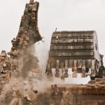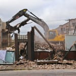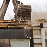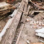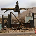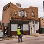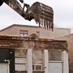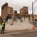 shortly after, the remainder of the building was brought down. i was lucky enough to not only document the demolition of the facade in a sequential manner (see above), but catch a glimpse at the sill plates used in each of the four structures. interestingly, they were a combination of wood-framing and masonry. based on my observations of the materials and methodologies, the earliest structures may very well date to the 1860’s – possibly residential transplants brought across the river from the downtown district as it quickly expelled or replaced most of the cottages with more and more brick commercial buildings.