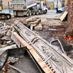 after taking it all in, i called the shop to inform my staff i would be running late. i pulled over and managed to get on the jobsite where i worked out a deal to salvage the woodwork. within 30 minutes the facade was down, but in the process the wrecker managed to pluck the entire sill course from its resting spot and carefully swing it around and off to the side for me to deconstruct as i saw fit.