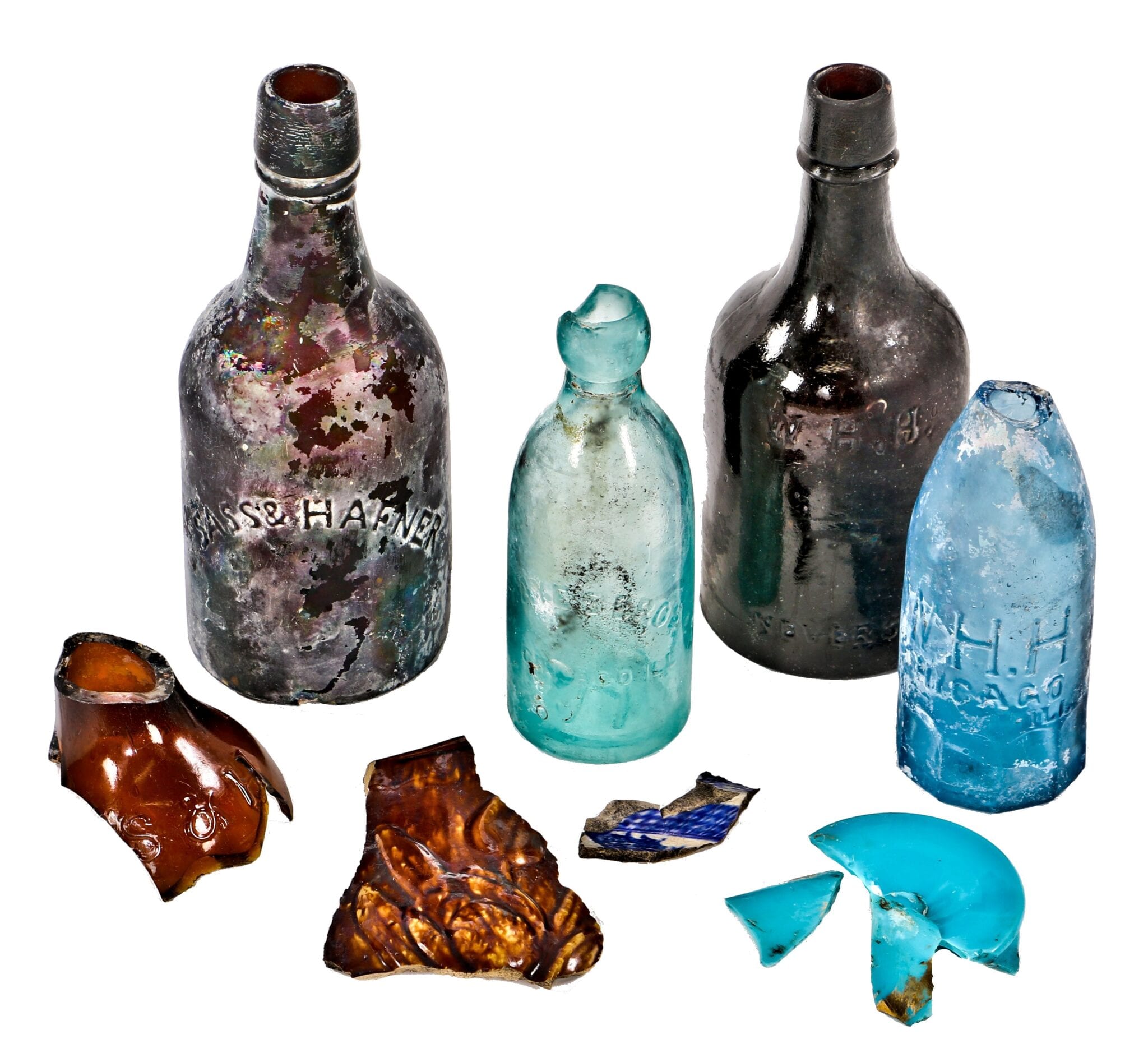 since one of my primary digging interests pertains to early william hutchinson bottles, i was pleased to discover a quart-sized “black glass” ale bottle free from damage. the other “w.h.h.” bottle i found resting nearby was a paneled or “mugbase” blob top soda bottle fabricated by the mccully glassworks, pittsburgh, pa. despite the latter being heavily damaged, it was still nice to find two of these bottles in close proximity. after i finished documenting the site, i brought back some of the finds to clean and photograph in the studio. i’m hoping that the excavation will yield several more bottles and/or artifacts left behind by the occupants of these non-extant buildings.