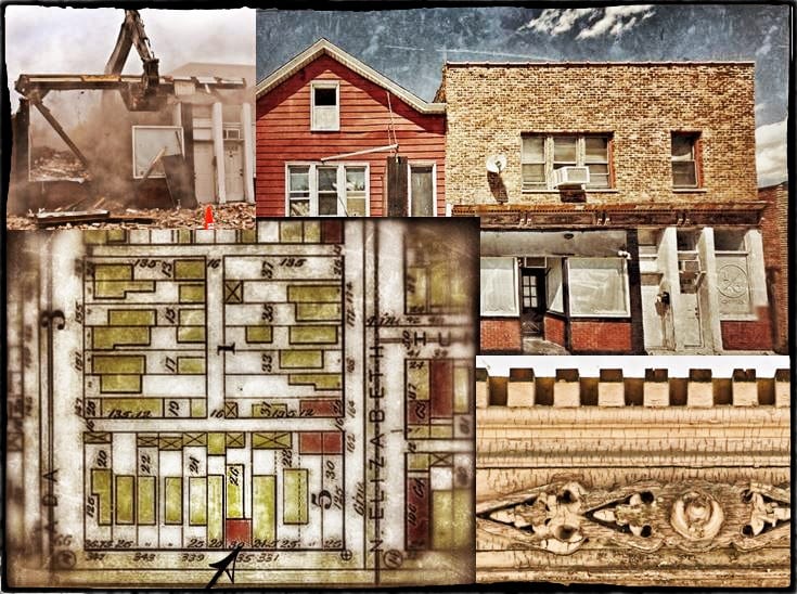 in the following weeks i closely monitored the building. i noticed the power lines were cut and the gas was shut off. then the excavator arrived. the very next day the machine had already pulled down the “coach house,” garage (which according to an 1886 sanborn insurance map was formerly a stable), the wood framed house on the adjoining lot, and the residential section of the brick storefront. in other words, only a small portion of the building that interested me remained standing.