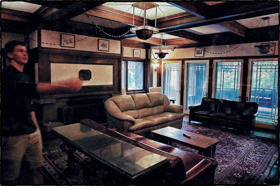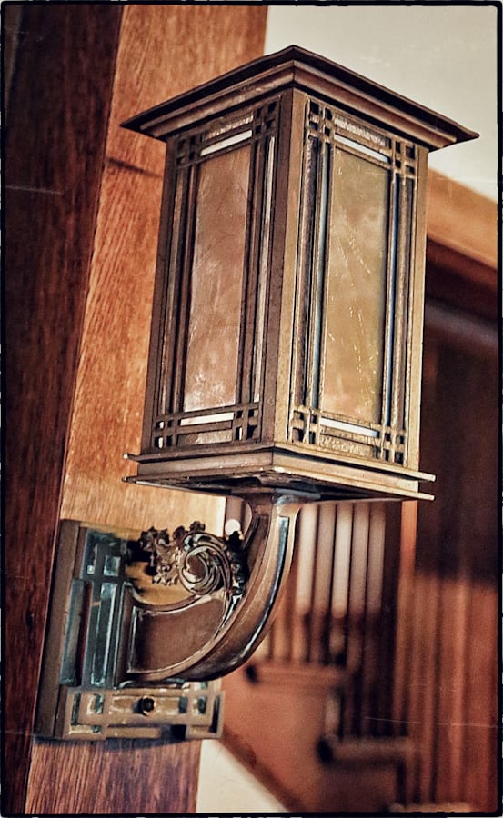 after i photographed the house’s exterior, my family and i approached the front door, with my significant other leading the way. we were at the house. i badly wanted to see what remained of the interior, but the idea of being intrusive or an imposition to the occupants prevented me from knocking on the door. before i could feel defeated over my own insecurity, the door opened and a very nice young man greeted all of us. he was more than willing to show us around. i was floored. our tour guide, sigma phi fraternity member alec hill took us through the house, room by room. i tried my very best to listen to his highly informative “off the cuff” dialogue about this or that, but my mind’s eye, and camera lens, was drawn to the finely detailed and heavily ornamented copper-plated cast iron and brass art glass sconces and ceiling fixtures likely executed by the winslow brothers of chicago, ills.