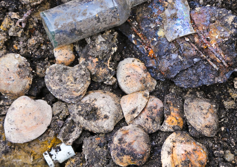 looking back, the only defining moment of discovery was a massive pile of clam shells i found in the southeast corner of the lot. there must have been at least a couple hundred shells. in past digs i’ve come across several animal bones (mainly pig and cow) with the occasional clam shell, but this mountain of shells was a sight to behold. i immediately thought that a restaurant or grocery store may have occupied the site – likely during the 1870’s, since surrounding glass shards and complete bottles provide an approximate date.