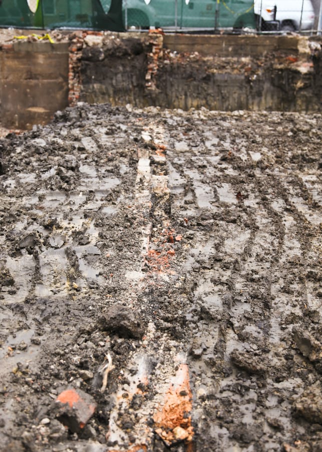 with four houses, a brick storefront and a stable all built on two adjoining lots, i was convinced there would be quite a few artifacts to collect and study. however when the excavator had finished “grading” (approximately 7 feet below street level) and the cement trucks began lining the streets, i was a little disheartened that there wasn’t more trash left behind.