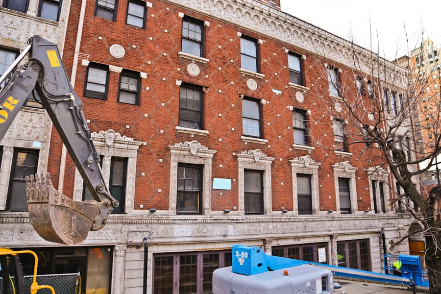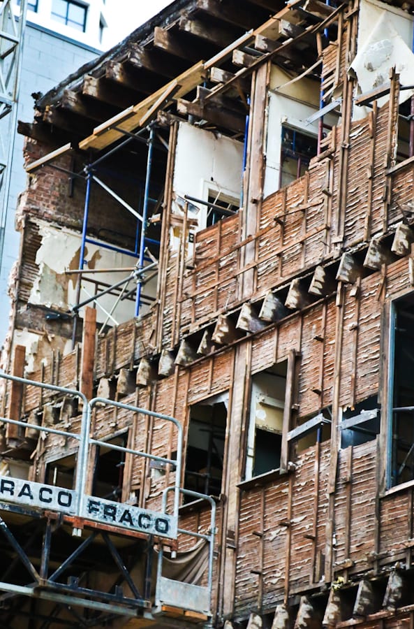 when i dropped by this afternoon, the contractor had already skinned the majority of the hotel’s facade, leaving exposed lath and plaster joists. it definitely wasn’t something you see everyday. every brick and decorative terra cotta piece will be removed and put into storage, while the building they protected is demolished.