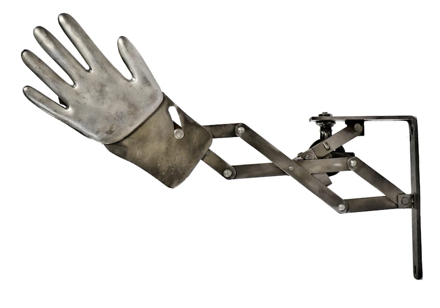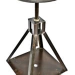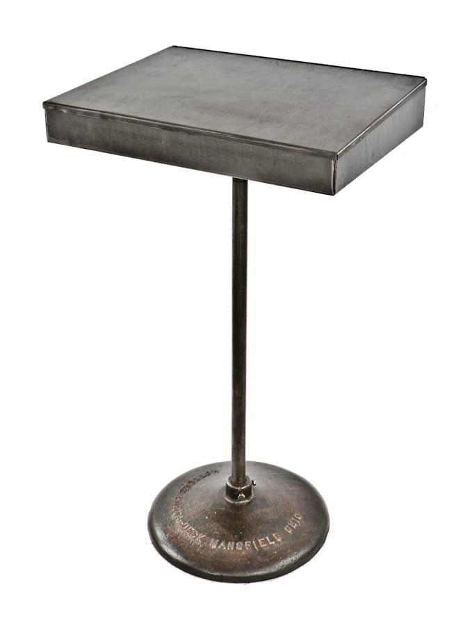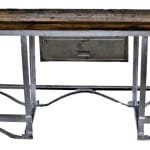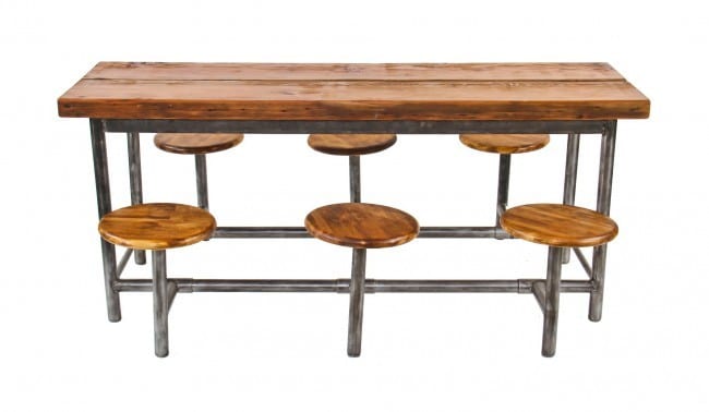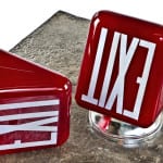 factory lunchroom tables, ruby red exit lights, repurposed furniture, signage, and chicago tribune building doorknobs