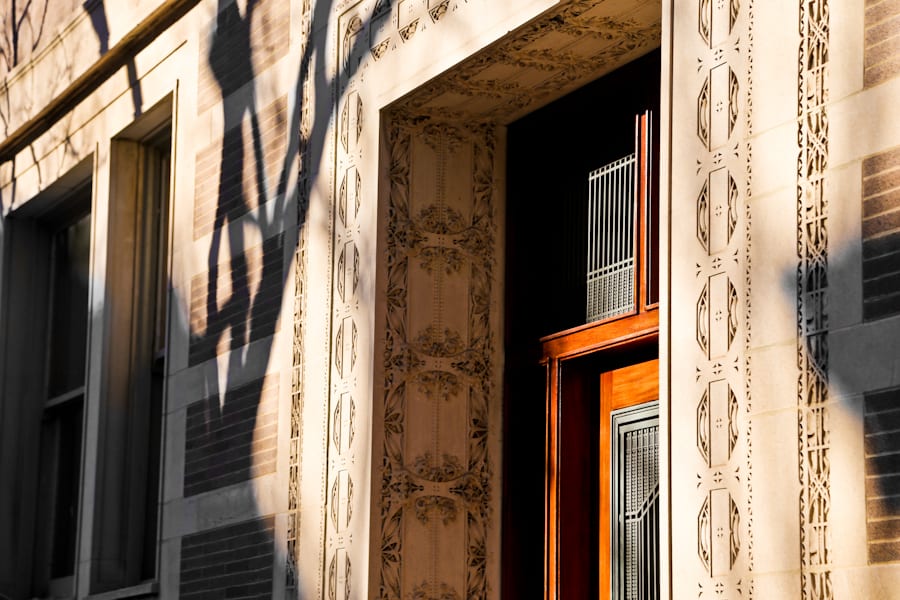 albert commissioned his brother-in-law, richard e. schmidt to design and construct a house on west burton place in the gold coast. the architect and his collaborator, designer hugh m.g. garden, accepted the commission, and the home was completed one year later in 1902. in keeping with the prairie school’s appreciation of local building materials, the exterior of the madlener house is constructed of brick and intricately carved indiana limestone. the architects gave special attention to the entryway, with the ornament and bronze grill work (heavily inspired by the designs of wright and sullivan) designed by garden.