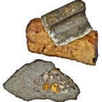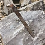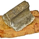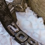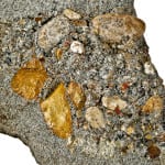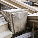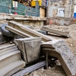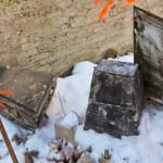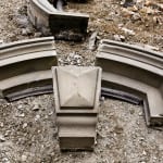 with their lunch break right around the corner, i waited patiently and continued to photograph more until the men and machines came to a halt. from there, i was given unabridged permission to wander near the remaining facade. i closely examined the surface characteristics of each “stone” to determine whether there were any major abnormalities in shape, size or surface treatment, considering they were all cast from the same mold. in addition, i managed to identify exactly how the components were fastened to the masonry structure when i discovered several wrought metal straps or anchors still tightly embedded in the castings with not nearly as much surface corrosion as i would have expected, given the number of stress cracks seen on the facade; these were likely caused when the building “settled” as well as from prolonged exposure to the elements, including freeze/thaw cycles and water. a few of the keystones were somewhat disfigured – likely from botched castings, but when installed, it was not noticable. next, i wanted to understand exactly what the composition of the cast components, aside from aggregate or crushed stone and lime. as of this writing, my research is still ongoing.