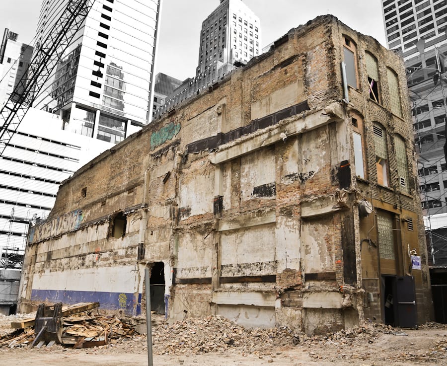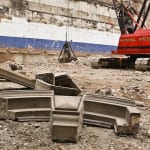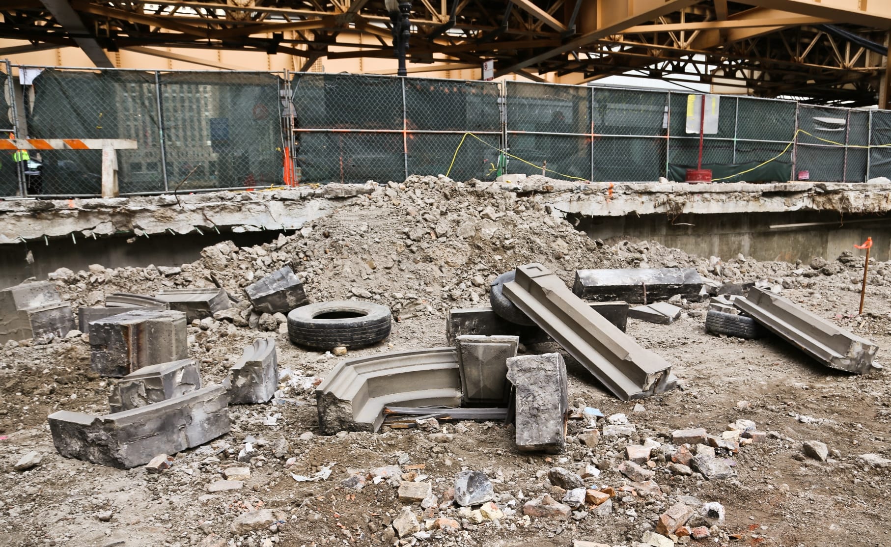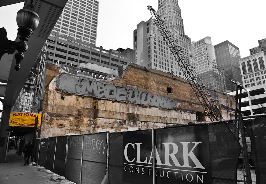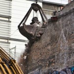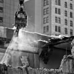 shortly beforehand, i had carefully worked my way into the chaos of falling brick, among orders being barked into walkie-talkies, the unforgettable screeching of excavator steel treads against drive sprockets and rollers, and the purring of diesel engines. the noise and pollution set a nice backdrop as i photographed the demolition from afar, trying to gain a better scope of the progress made since my visit the day before. as with all demolition projects, i have this unrelenting urge to capture the death of a building from the time the scaffolding goes up until the wall comes crashing down. the excavation to unearth long-buried artifacts is a completely different matter.