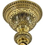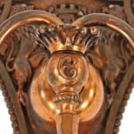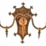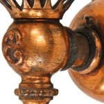 after further research, spearheaded by samuelson, it is confirmed that the late 19th century ornamented brass electroliers are indeed from the non-extant chicago stock exchange building (demolished in 1972). evidence for this was found in a winslow brothers catalog, and several images showing the double arm electrolier sconces installed in situ (in both corridors leading to the trading room and the trading room itself). we believe these matching sconces were removed from the west wood wall located under the trading room’s balcony. similar sconces with triple arms were mounted on the upper columns below the gilded cast plaster capitals.