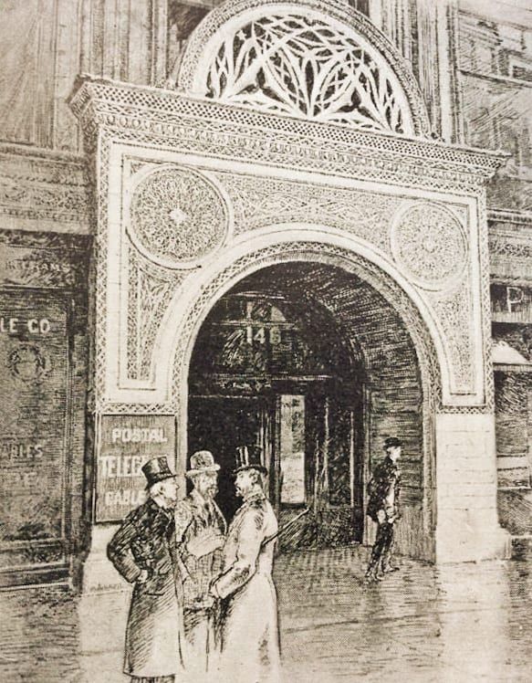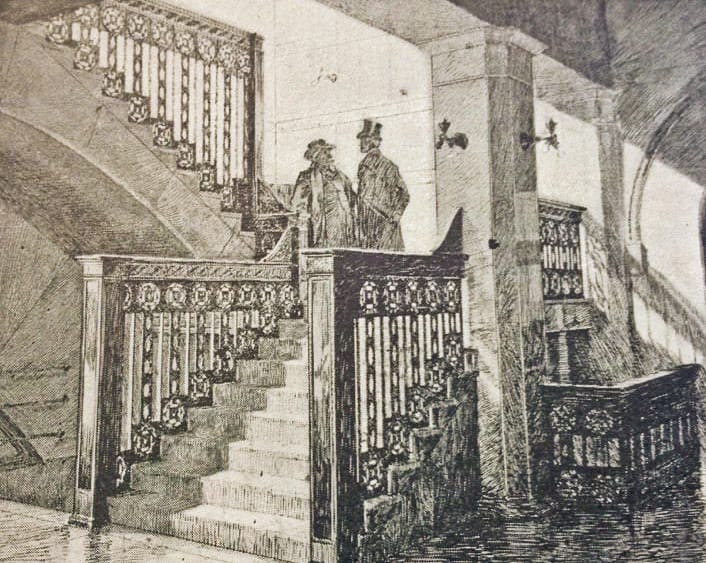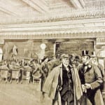 same photograph from above showing three double-light electroliers and/or sconces along the wall beneath the balcony. the shades were likely blue opalescent or vaseline-colored glass with ruffled edges. the two sconces acquired by the museum are believed to have been salvaged from the trading room.