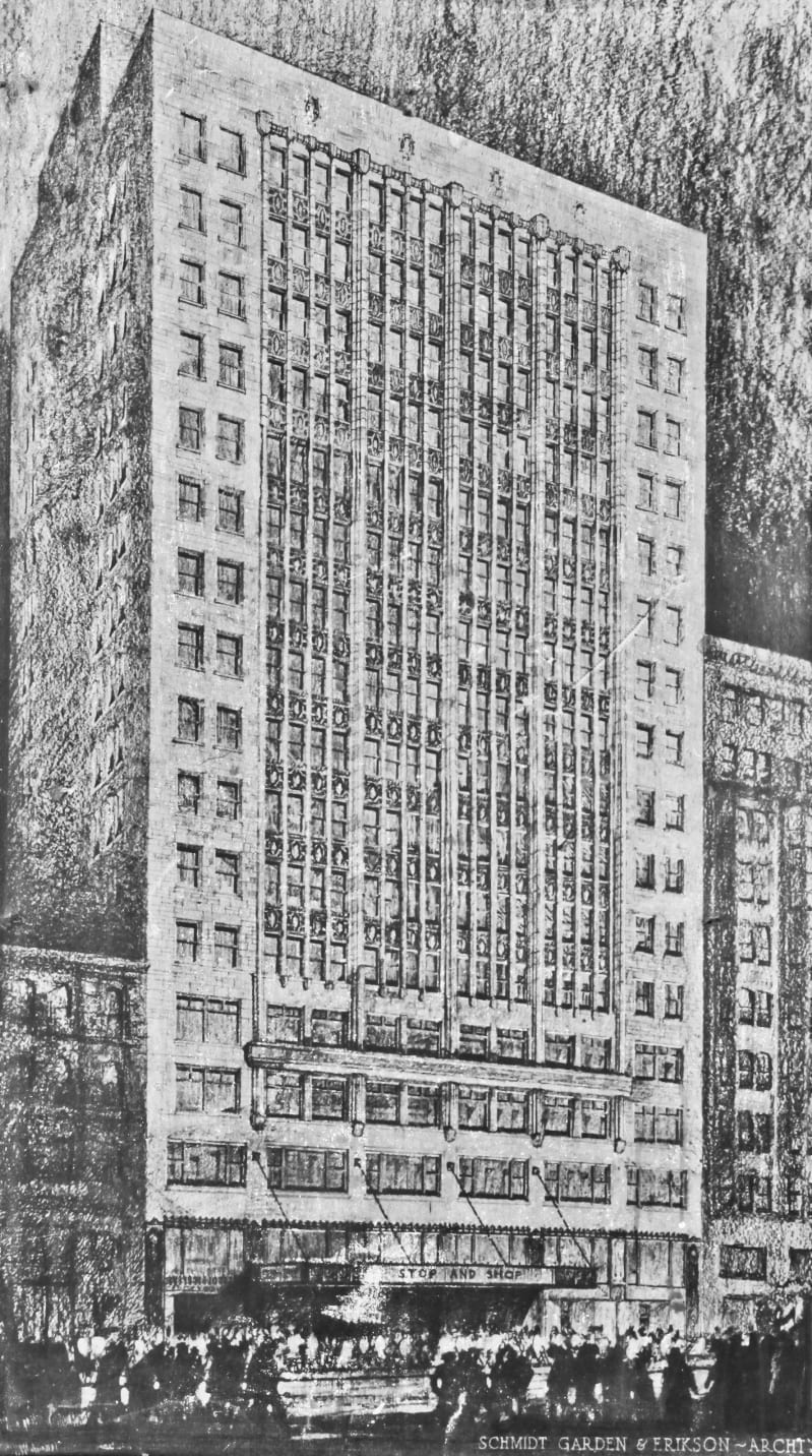 the non-extant stop and shop grocery store was part of block 37, one of the original 58 city blocks established in the 1830’s land survey that created chicago’s downtown. its strategic location between state and dearborn, and randolph and washington assured that the block’s original eight lots would be fully utilized in the city’s development. after chicago’s incorporation as a town in 1833, block 37 boomed, situated as it was in close proximity to both the cook county courthouse and the city’s largest bank. after the great fire of 1871 razed the already densely developed blocks, the city’s early offices, skyscrapers and supermarkets were all built on this site. directly following the fire, block 37 was rebuilt at four times its original square footage.