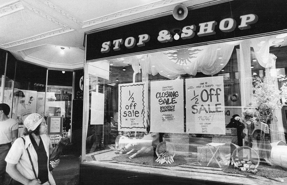 throughout its moves, this luxury urban grocery market filled a niche in offering high-end imported foods, including products as exotic as hippopotamus meat and shark fin soup. stop and shop was a small operation but offered rare and high quality imports to wealthy chicagoans, all under one roof. they also ran a large catering business that specialized in prepared foods, specialty candies and deli items. the produce and deli offered unprecedented variety, with specialty sausage and cheese, and upscale meat prepared by active butchers. they also provided phone ordering and delivery service all over the city. stop and shop shuttered its loop location in 1983, a victim of urban renewal.