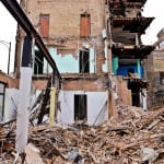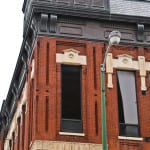 voltz hall underwent extensive remuddling, or a very poor attempt to recreate its former elegance. this was evident in its reproduced cornice, increased erosion to the face brick from aggressive cleaning methods, and replaced windows and storefront. there really weren’t many original elements to salvage except for the limestone, in the form of pyramidal-shaped window hoods with centrally located “bullseyes” and an unusually truncated double-sided limestone frieze or banding exhibiting lightly carved simple floral forms.