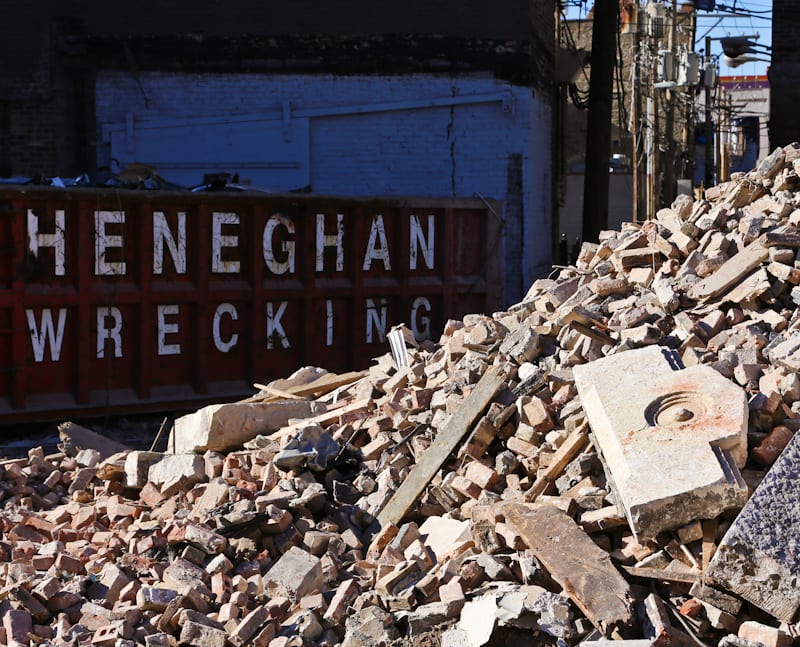 following up on the recent demolition at the corner of wells and chicago, of the former “voltz hall” — i cannot help but return time and again to sites that peak my interest. over the weekend, i identified one of the limestone window headers laying largely unscathed on the remains of the former 19th century german saloon.