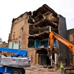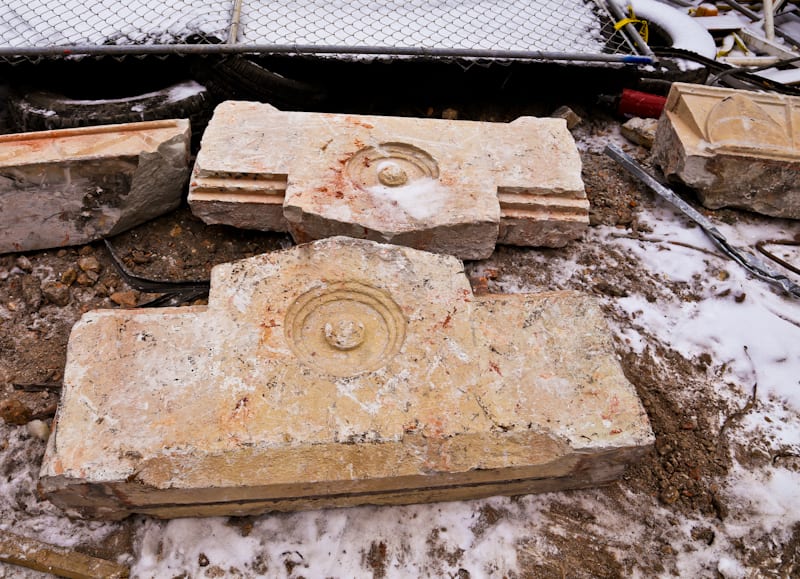 on sunday night i reached out to project manager, greg (a good friend, and someone i’ve known since the nortown theater salvage), asking if he could set aside that “athens” cut limestone window header for me to pick up the following day. after negotiating the deal with heneghan – a wrecker i’ve also worked with for ten years – i arrived onsite to secure the large, extremely heavy header, and any decorative limestone elements that greg was kind enough to pull out from the pile before my arrival.