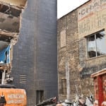the newly added “historic” or rather cartoonish decorative copper cornice was a mockery of the original, the was recklessly stripped off at same time when the beautifully patinated soiled masonry was sandblasted away, leaving a grotesque looking red-orange color.