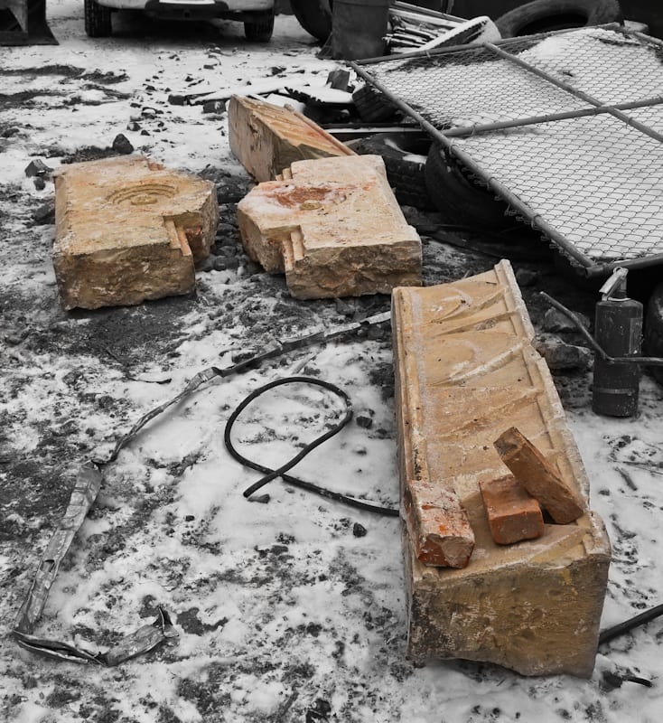 25 Jan with keystones and now ironwork rescued from landfill, not all is lost at the former voltz hall building