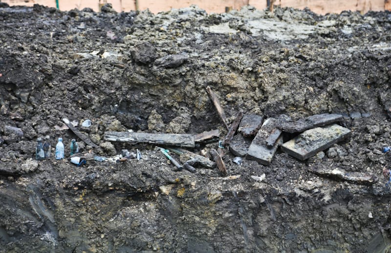 in a way, i’m glad i was not there to witness this, since i doubt the owner would have been swayed by my pleading to stop, verbally or with my wallet. as soon as the operator i work with arrived to take over, i received a call that bottles had been found on an excavation site, and some wood that “may have been a privy like the ones you’d described.” my heart sank, but at least he had some of the bottles and sections of the privy’s pit “architecture” for me to come look at.