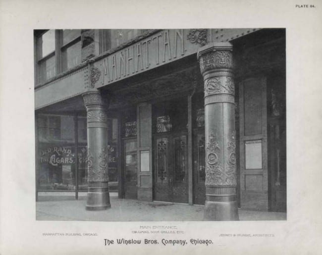 constructed with a floating foundation, the manhattan’s cantilevered bay windows create strong visual dimension and exhibit the innovative engineering for which jenney is known. it utilized cast iron panels along the ground floor, appearing as applied cladding for the framework instead of support. the building is decorated with capitals along the 12th floor and some masks and vegetative detailing on the brackets of the fourth floor. polygonal oriels placed in the center of the west facade rise higher than the flanking rounded oriels. although the main entrance has been covered over and the public interior spaces have been altered, the original facade has remained virtually intact. the most conspicuous exterior alteration has been the addition of a single bay on the outer flank of the tenth floor.