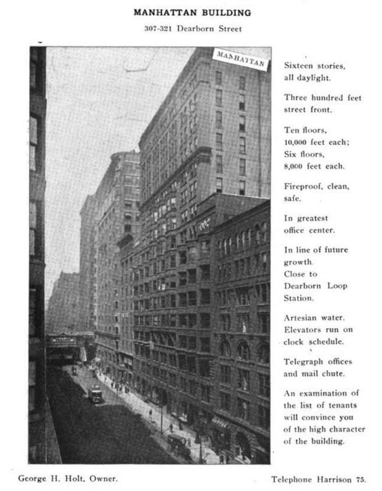the manhattan building was built between 1889-1890 at 431 s. dearborn and became the first skyscraper to attain a height of 16 stories, wedged between a 7-story building to the north and the como block to the south. the new skyscraper cost $850,000, contained 600 offices and featured three retail stores on the first floor as well as five hydraulic passenger elevators.
