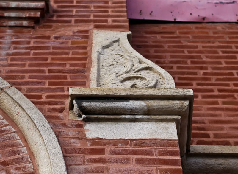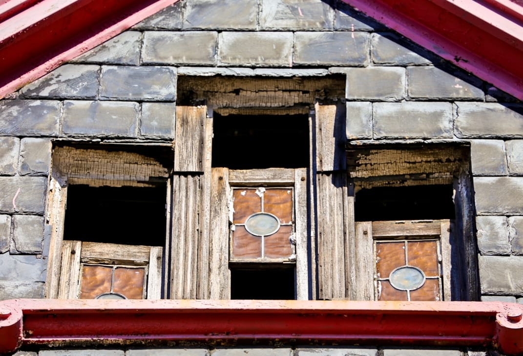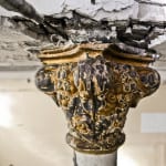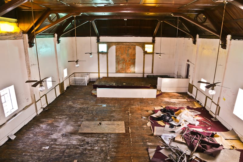 the interior salvage process yielded cast iron capitals from the basement, ceylon hardware, and original wooden railings. the building itself has suffered many alterations, with the most visible loss being the upper section of a turret at the corner of the building. barely any stained glass remained, and the windows had been bricked in as well.