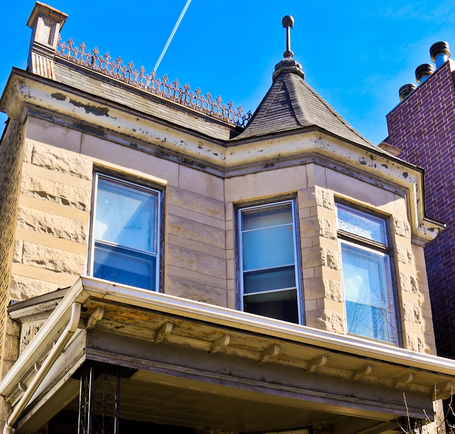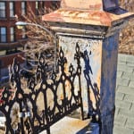early in the morning i received notice that a late 19th century two-story graystone was handed a death sentence. after reviewing images of the facade, i was drawn to the matching leaded beveled glass transom windows and roofline ornament consisting of cast iron cresting or “window’s walk” and an oversized ornamented tin ball-topped finial resting atop the towering three-sided turret or projecting bay window. the end-caps flanking the off-centered turret are comprised of pressed and folded tin with pyramidal-shaped finials.