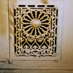 after an hour focused on documenting and carefully extracting the exterior ornament, we turned inwards, where only a few architectural fittings original to the house were discovered intact and largely unaltered. nearly every flush mount louvered wall and floor grate (fabricated by hess warming and ventilating company and the tuttle and bailey company respectively) were found on both the first and second floors.