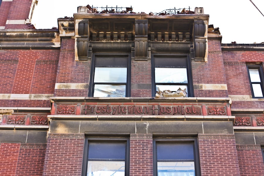 15 Apr partially-demolished 1880’s chicago presbyterian hospital building facade ornament awaiting rescue