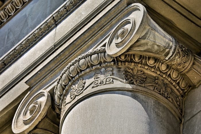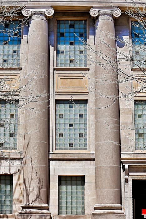 when i was notified of the building’s fate, i quickly made my way over to begin documenting it before the green fence and/or scaffolding was put into place. from afar, i didn’t notice any immediate signs indicating its impending doom. upon closer inspection however, i was taken aback over the fact that the power to the building had already been cut and the placement of a bright orange “building closed” notification which clearly provided evidence that preparation for demolition was well on its way. despite this, i managed to capture photographs of the facade, with its carved “bedford” or indiana limestone facade containing massive cylindrical columns topped by ionic capitals accentuated with high-relief egg and dart and anthemion design motifs wrapped beneath the protruding volutes.