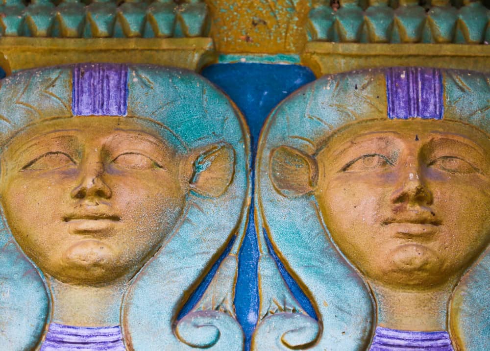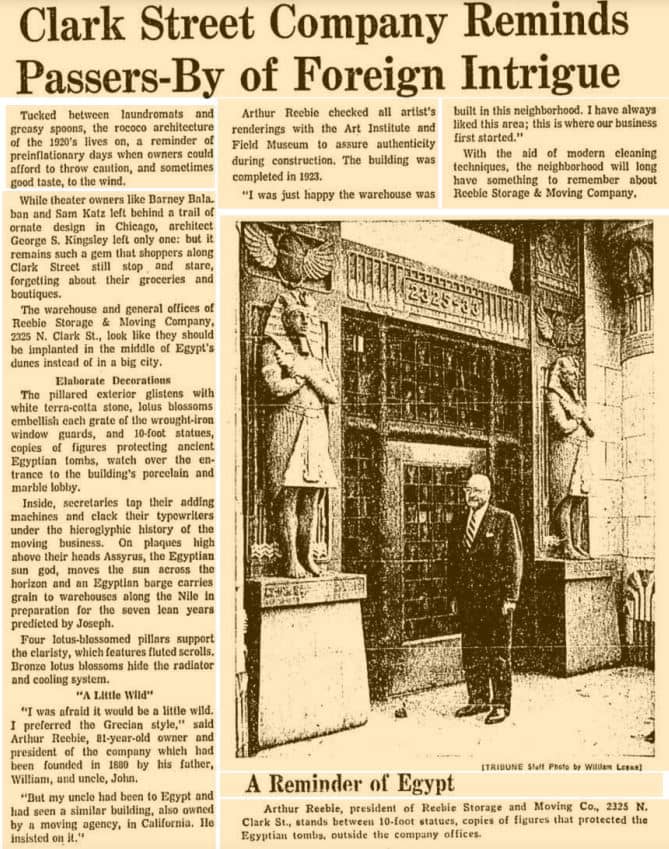 symbolism on the interior lobby and facade alluded to egyptian themes, as well as to the building’s use. twin statues of ramses II on either side of the entryway stand in for the reebie brothers, william and john; beneath these, their names are spelled out in hieroglyphics equivalent to the phonetic spellings. above the statues are a high-relief scarab and two faces representing the goddess hathor. papyrus plants decorate the base and capitals of the columns. all the ornamental drawings for the reebie warehouse were reviewed for accuracy by both the field museum and art institute prior to their implementation.