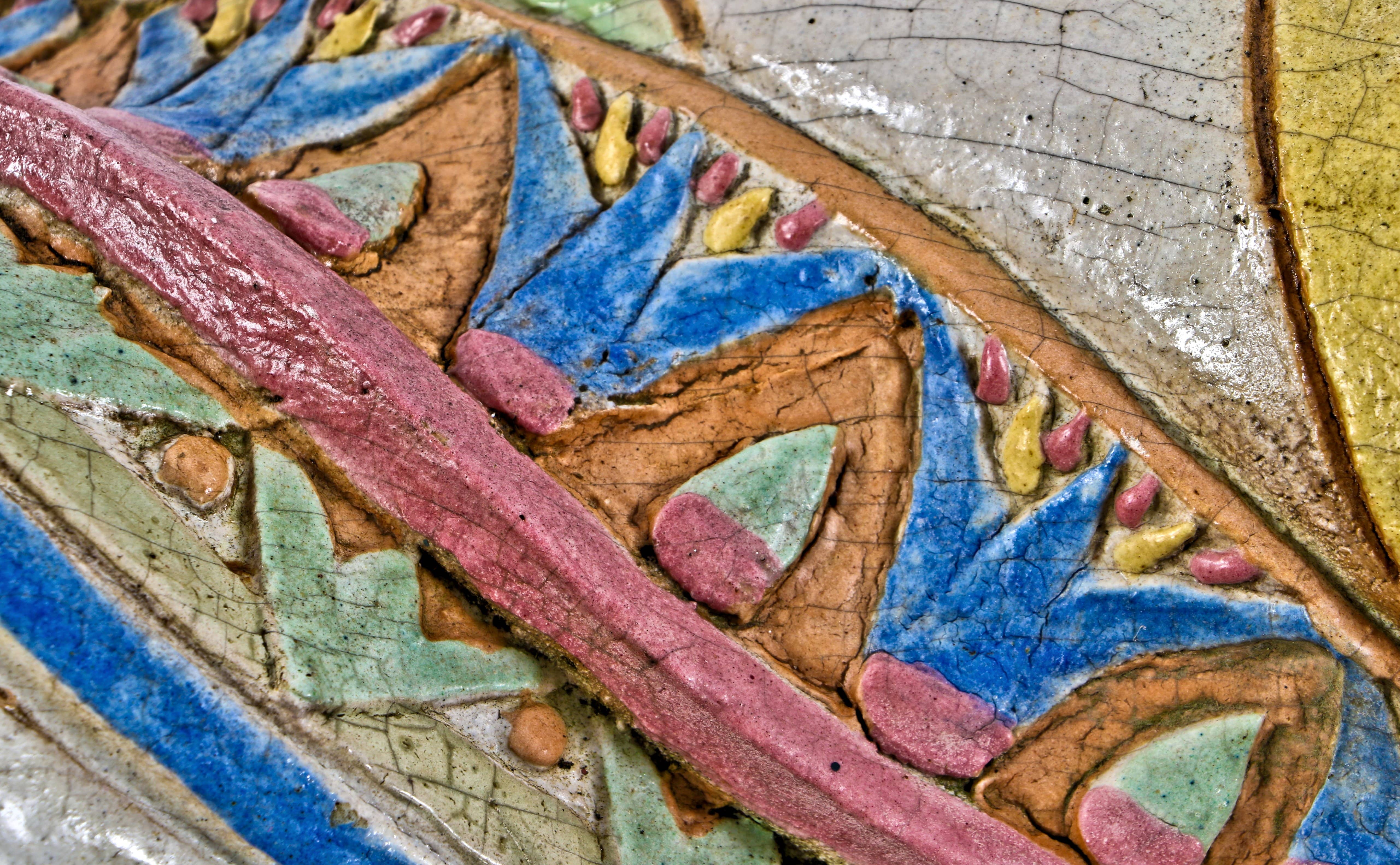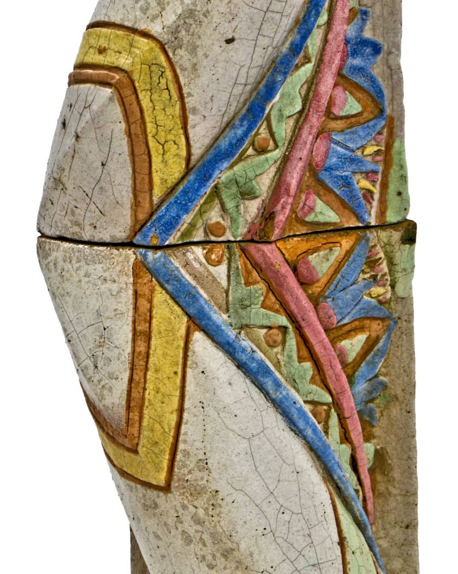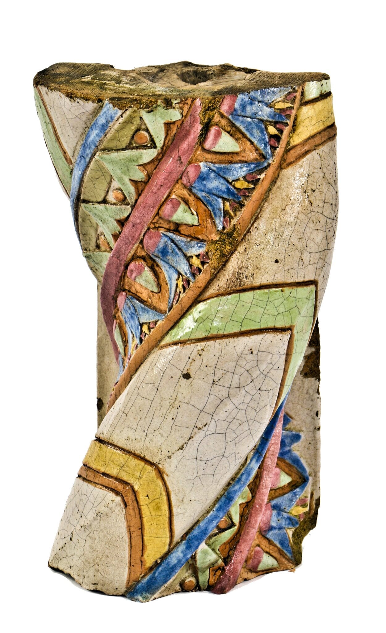 this glazed, polychrome terra cotta is semi-circular in shape, a piece of twisting banding that features allover crazing, and an unusual visually striking coloration in a pastel palette of green, pink, blue, and yellow accentuating the egyptian design motifs. it was originally situated as one ovf several top floor window surrounds and/or banding.