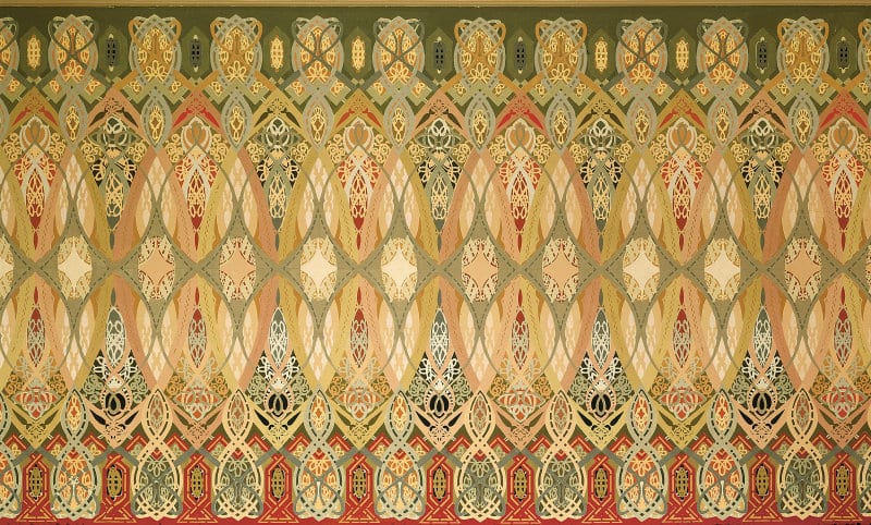 the impressive stenciled canvas painted in a muted green, gold and red palette was executed by louis j. millet for the 1894 st. louis union interior headhouse. the finely executed canvas represents the “core” design with a partial repeat accentuated with several colors. the frieze panel was originally mounted against the wall beneath the romanesque columns. millet was given quite a bit of creative input into the overall design configuration, so it’s no surprise that the canvas incorporates “sullivanesque” design elements, since it was likely being worked on near drafting or drawing tables displaying the canvas designs for adler & sullivan’s chicago stock exchange trading room, completed in 1894 – the same year the st. louis train station was built.