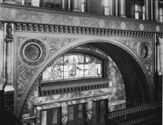 in the most ornate section of the entire building, the grand hall exhibited gilded arches and a 65-foot barrel vaulted ceiling decorated wholly with stained glass, mosaics, and gold leaf, as well as scrollwork and elaborate plasterwork, mostly executed by craftsmen from st. louis.