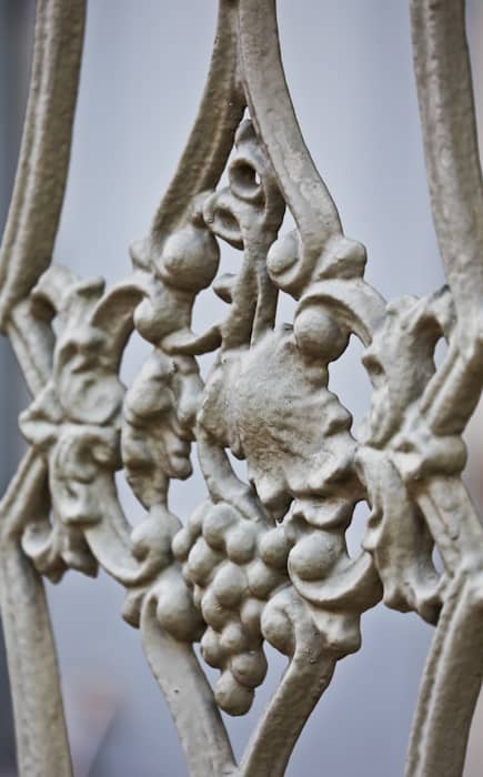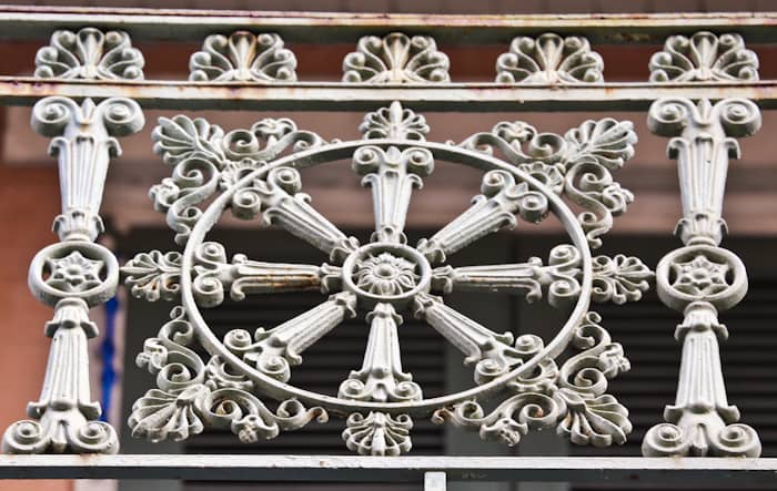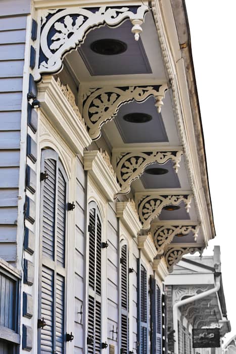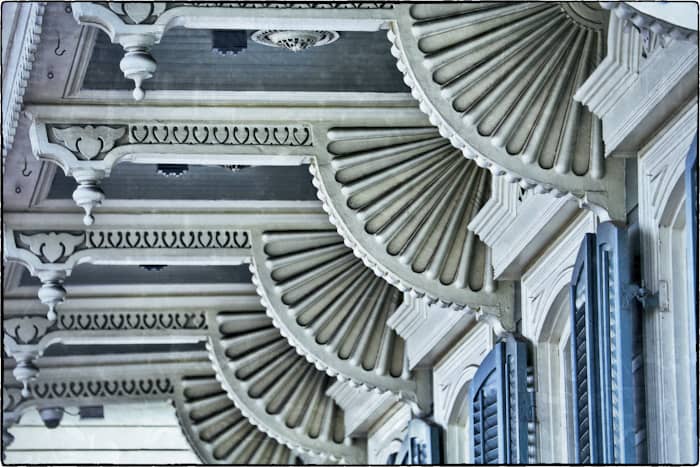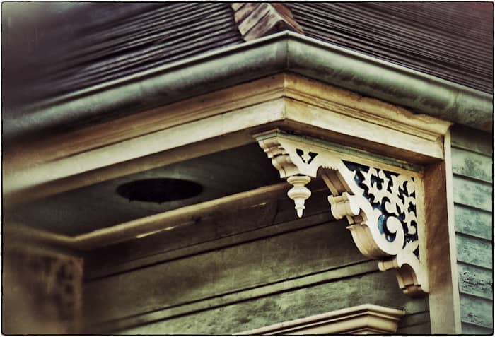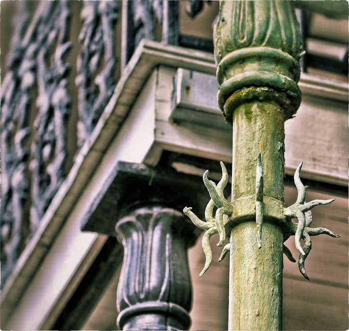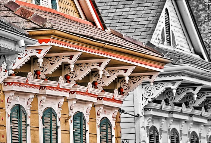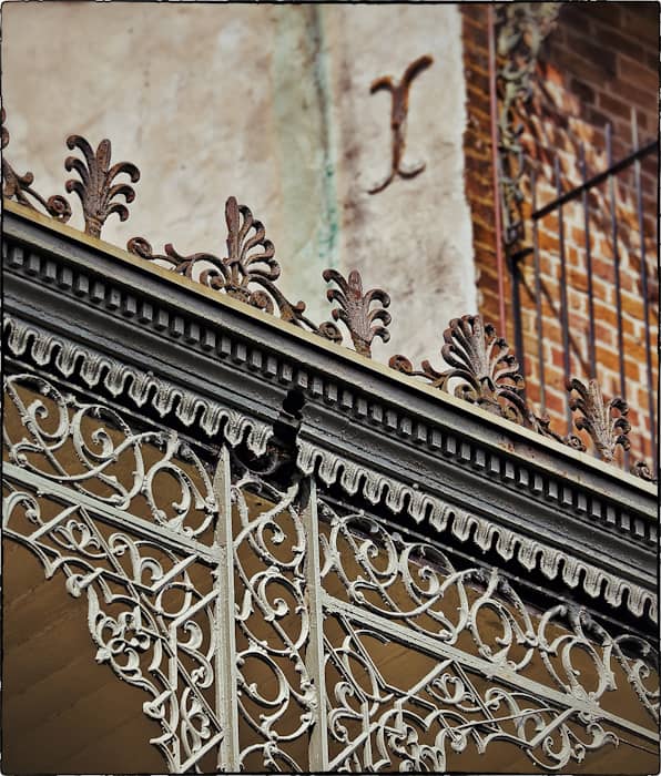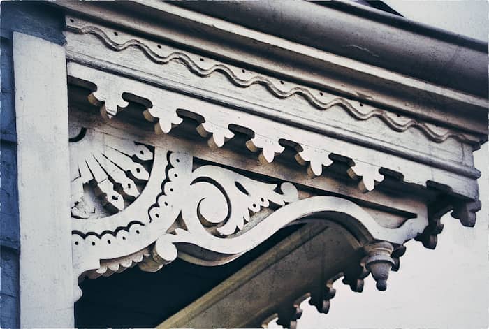 like san francisco, there was an abundance of brightly painted decorative woodwork, in the form of bracketed cornices, window and door hoods or headers, door molding, and so on. “explosions” of heavily ornamented metalwork wrapped around balconies and galleries, protruding from the facades of largely bland multi-story buildings. this was overwhelming at first, but after a while i managed to start teasing out patterns in both configuration and style, based on the time period or type of structure it was applied to.