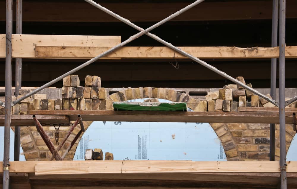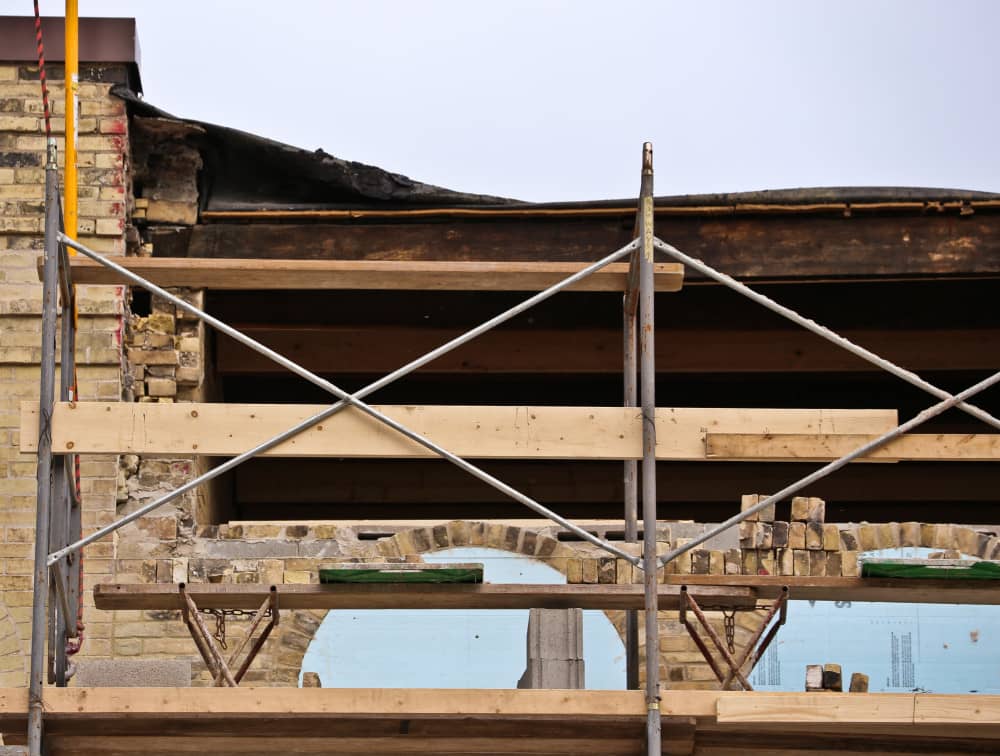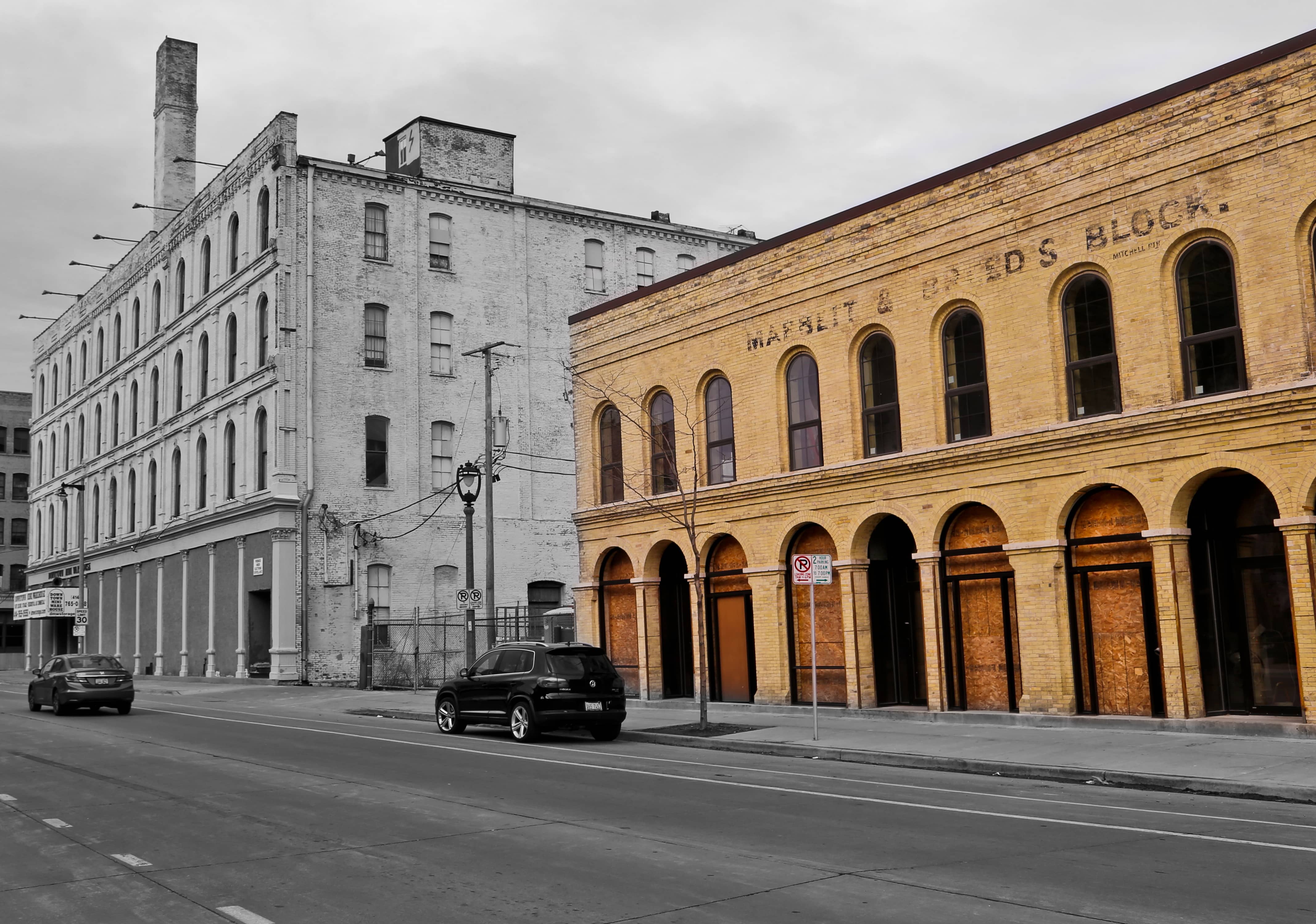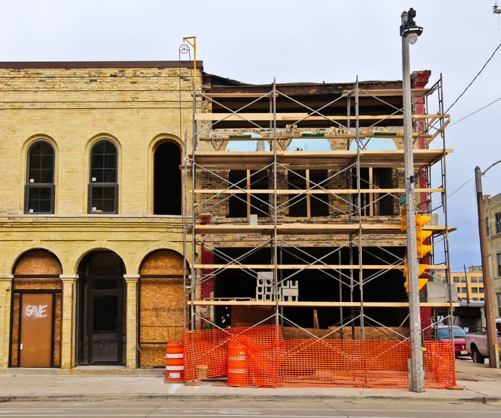 originally the buildings housed a variety of merchants, from leather and furniture retailers to a dry goods store and an apothecary. all four properties were purchased for redevelopment as a multi-use retail and apartment project, and as of recently the entire complex has been gutted, being refinished with wooden studs and drywall.