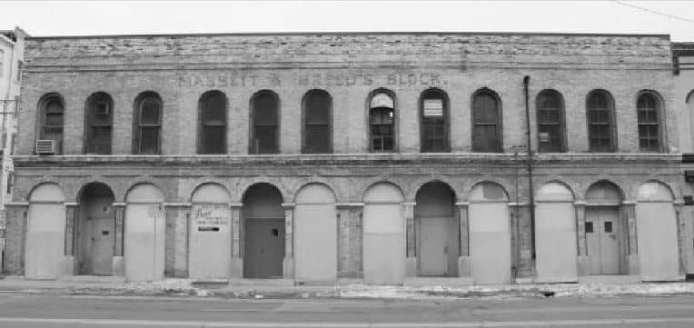the facade bears the name “mabbett & breed’s block” above the second story arched window openings, reflecting the lumber merchants– hiram mabbett and charles breed– who commissioned the construction at 184-188 s. 2nd street in 1858. the corner building dates to 1868, while an adjacent structure at 130 w. pittsburgh avenue was added as late as 1947.