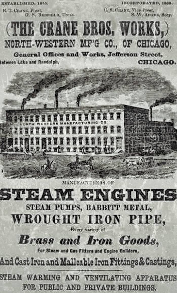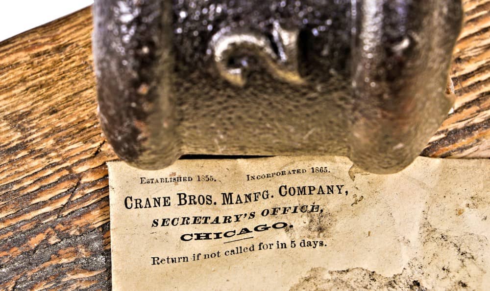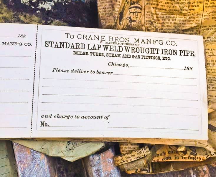 while the mountainous piles of rubble were being carted off, the last remains of the recently demolished crane brothers mfg. factory building addition (the main building constructed in 1865 still stands), i discovered a small cavity against the foundation wall that yielded a wealth of artifacts. the 19th and early 20th century ephemera uncovered there pertain to a time long ago, when the company was fabricating and distributing hundreds of brass and iron pipe fittings to accommodate steam systems, in buildings all across the country.
