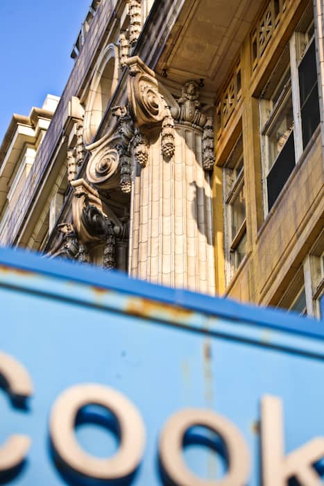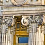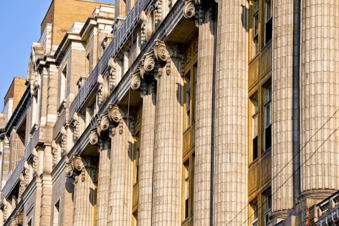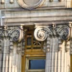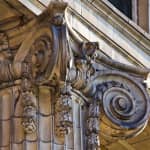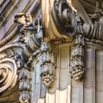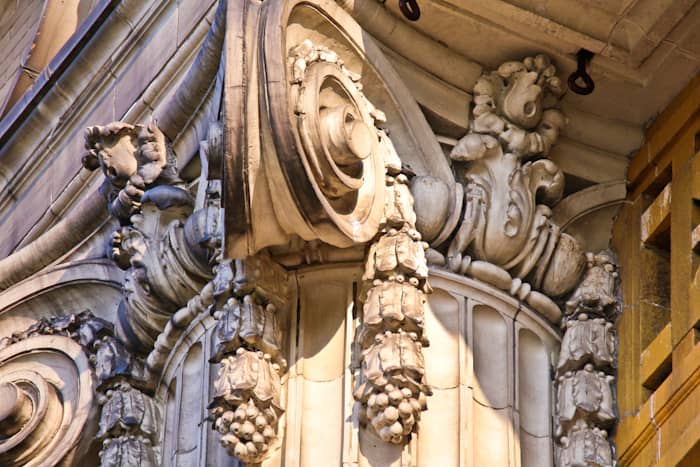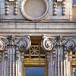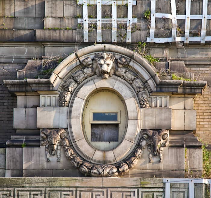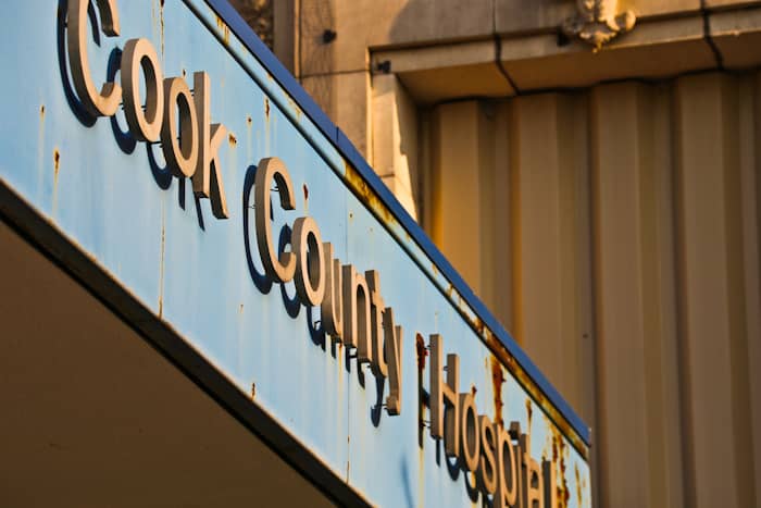 in december 1910, paul gerhardt replaced william holabird as cook county architect, and in this position, he designed a new hospital to be constructed along 1825 west harrison street. in the end, gerhardt struggled with the board over different issues, and was forced to resign. his post was handed over to richard schmidt in january of 1913, though the original design of the hospital, completed within that year, was attributable to gerhardt. it remains of his best-known buildings. the 8-story structure features lavish detail: baroque cartouches, 3-story fluted ionic columns, classical moldings and pediments, and faces of lions, cherubs, and human figures all along the steel framed building, clad in yellow brick, gray granite and variously colored terra cotta. the following gallery of images shows the exterior, captured during the “golden hour,” when the evening sunlight cast an exceptionally warm glow along the intricate stone surfaces.