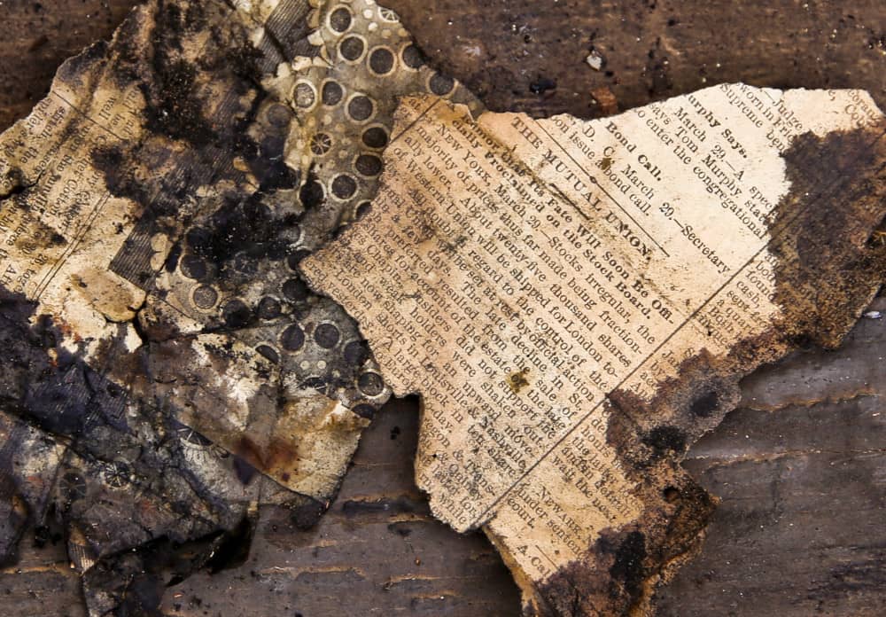as i moved around, taking notes and photographing the little nuances that make each and every house pleasingly unique, i spent some time around a collapsed wall that made the ridge board easily accessible. the cavities between the studs contained piles of clutter, including insulation in the form of mortar and lath wedged neatly within these spaces, atop the ridge board. there i managed to find bits and pieces of ephemera (mostly newspaper) that either made its way there through countless excursions by mice or rats (though typical nesting materials were not found in the mix) or was left intentionally by the carpenters or occupants. either way, i managed to extract enough information from the brittle fragments to determine an approximate date of the paper (1878-1881). judging by its location, it may very well align nicely with the age of the house. i’ve mentioned this technique many times before as a way that i collect data to assist in dating a house. this is especially helpful if it was built before the great chicago fire of 1871, when all of the city’s records and/or permits were destroyed in the fire.