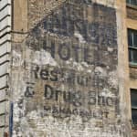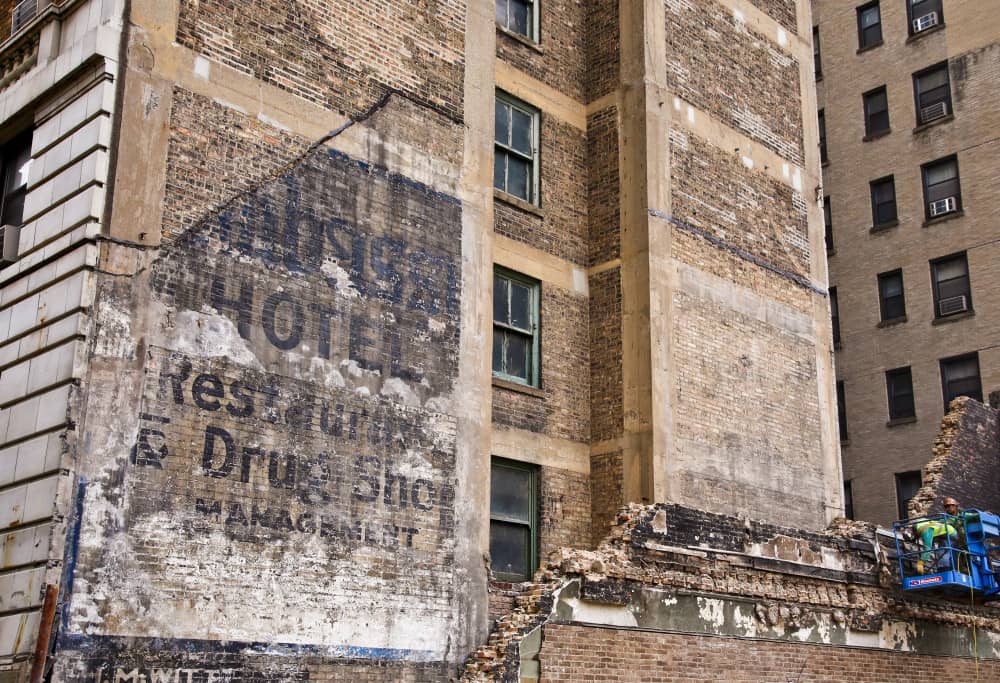 an incredible find was made earlier this week during demolition in lincoln park, as heneghan wrecking company tore back the walls of a c. 1927 grocery store. while the structure was turned to rubble, a long hidden “ghost sign” was unveiled on the neighboring building, having likely been covered over during the grocery store’s construction. the hand-painted advertisement on the ambassador hotel’s west masonry wall was executed by a company that still exists today, its ethereally faded paint reads in large black and white lettering “ambassador hotel/ restaurant and drug shop/ management/ h.m.witt.”