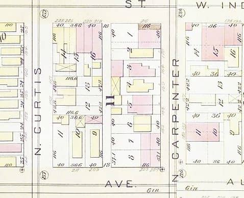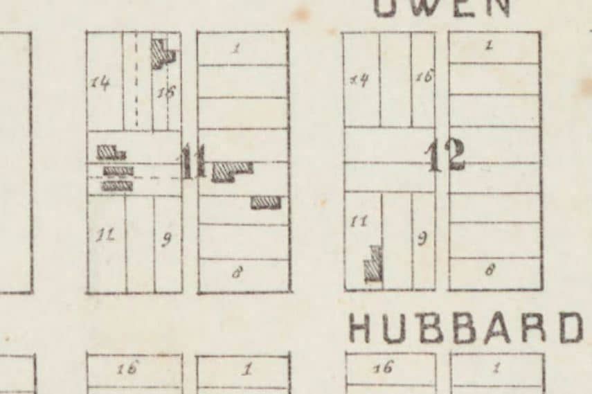 even when the illustration seems infused with a little uncertainty, i appreciate greatly being able to use this map to visualize areas in which i’m salvaging, like the block surrounded by carpenter, owen (now grand avenue), hubbard, and curtiss (now aberdeen). there, i can see that in 1857 the block contained not just one, but multiple single and two-story wood frame cottages. the city directories printed a decade or so after the city was incorporated (in 1837) list residents living along the streets surrounding this block, which corroborates the accuracy of palmatary’s depiction.
