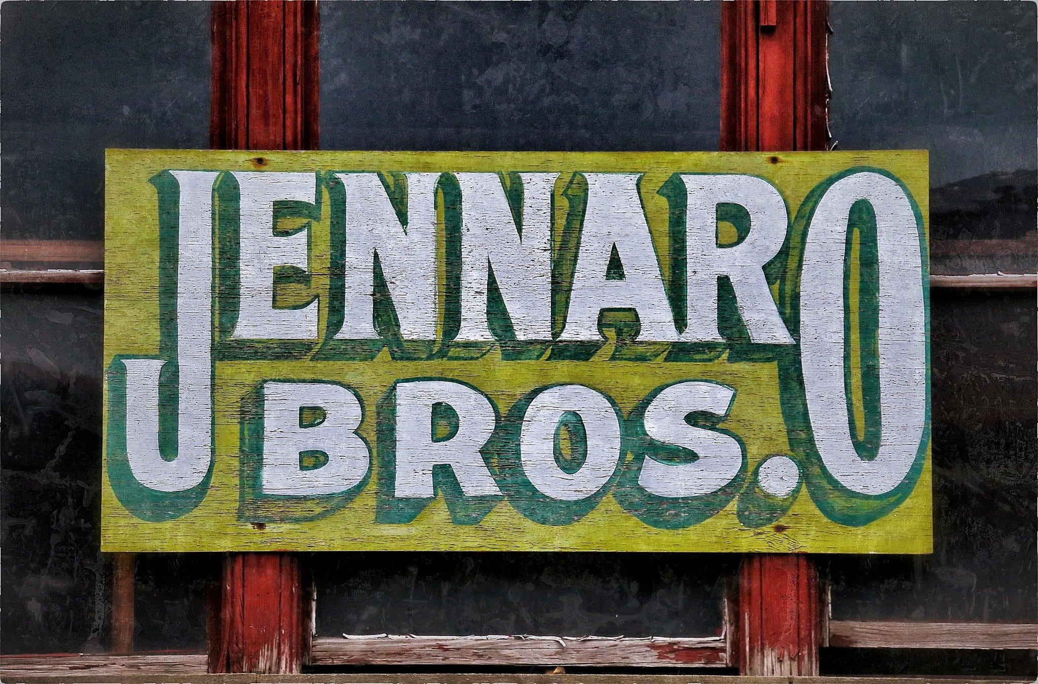 hand-painted wood sign with shadowed lettering, jennaro brothers produce, milwaukee, wisc. the vacant building was purchased for redevelopment.