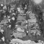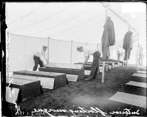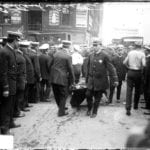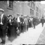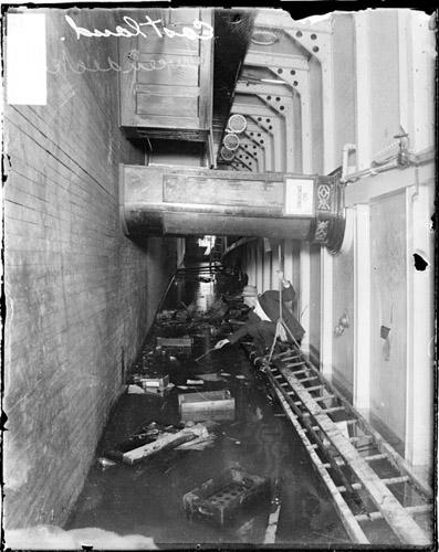 the eastland capsized close in time to two similar disasters–just 3 years after the titanic, and 10 weeks after the lusitania had been torpedoed and sunk. in fact, post-titanic safety measures (regulating a larger number of lifeboats on board) may have contributed to the eastland’s being top heavy, with unsafe weight distribution. though the eastland is dwarfed historically by the titanic, interesting perspective is provided by statistics– three times as many people were killed in the eastland disaster as the great chicago fire, and it represents the largest loss of life in a single event in the u.s. during the 20th century. in the wake of the accident, hundreds of corpses were taken to the second regiment armory (at washington and curtis) which had originally been a cold storage warehouse and now became one of the largest morgues used that day. photographs surrounding the tragedy depict long lines of relatives streaming into the armory to identify bodies.